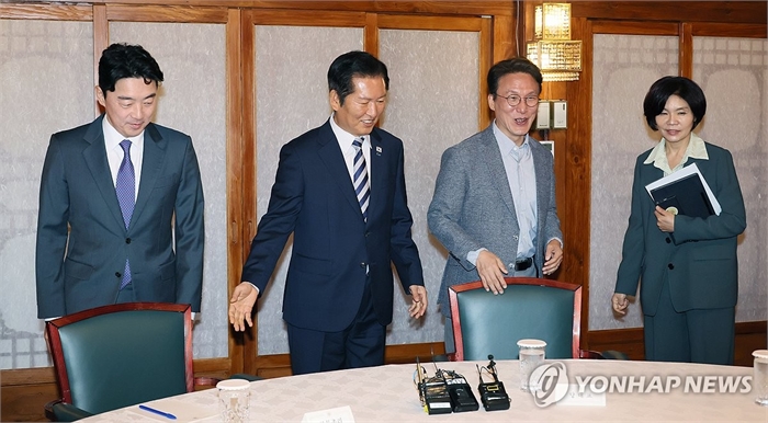 ▲ X 김민석 국무총리가 12일 서울 종로구 총리공관에서 열린 고위당정협의회에 참석하고 있다. 왼쪽부터 강훈식 대통령 비서실장, 더불어민주당 정청래 대표, 김 총리, 한정애 정책위의장. 더불어민주당과 정부, 대통령실은 12일 서울·경기 지역 집값 과열 양상과 관련한 대책을 이번 주에 내놓기로 했다. 민주당 박수현 수석
