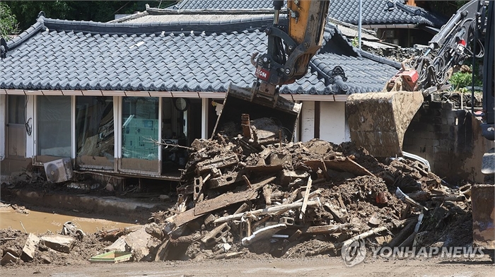 22일 경남 산청군 산청읍 모고리에서 굴착기가 최근 집중호우로 침수된 주택의 수해복구 작업을 하고 있다.