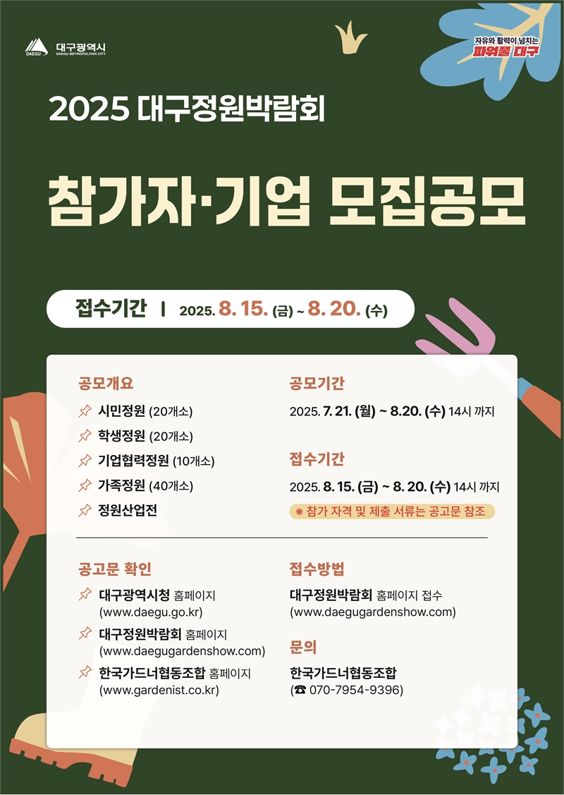 접수방법: 대구정원박람회 홈페이지 (www.daegugardenshow.com) 전자접수