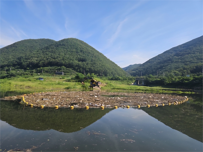 지난 23일 보현산댐에 부유물 처리 현장. 한국수자원공사 제공