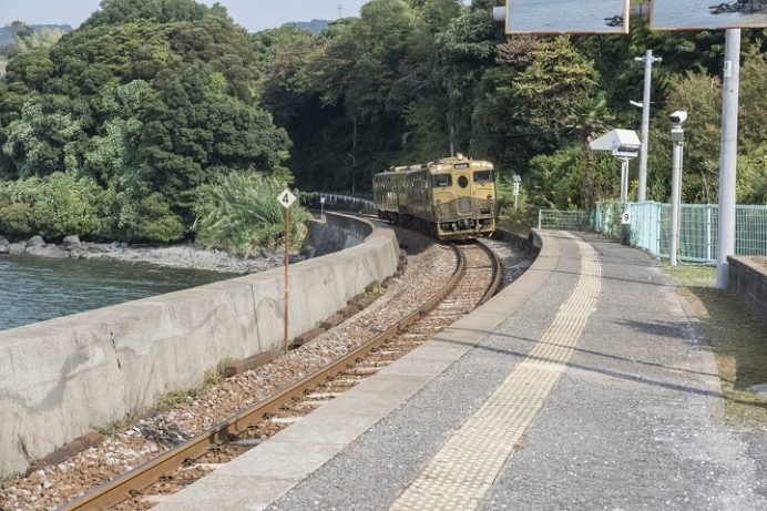 오무라 선을 따라 치와타 역으로 달리는 열차.