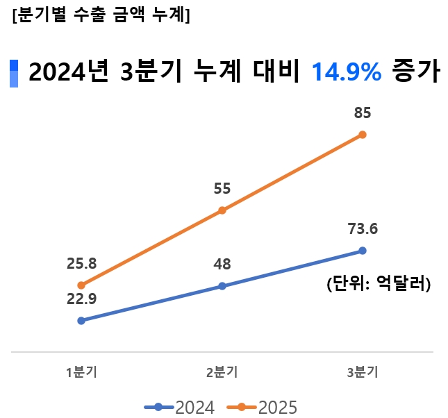 3분기 단독 수출액도 전년 동기 대비 17.5% 증가한 30.2억 달러를 기록했다. 특히 올해 1월을 제외하고 2월부터 9월까지 매달 해당 월 기준 역대 최고 실적을 이어가고 있으며, 9월 한 달 동안에만 11억 달러 이상을 수출했다.