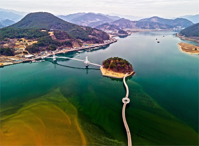 배알도 섬 정원은 550리를 달려온 섬진강이 바다와 만나는 곳에 마침표처럼 동그마니 떠 있는 낭만플랫폼으로 2개의 해상보도교를 통해 걸어 들어갈 수 있다.