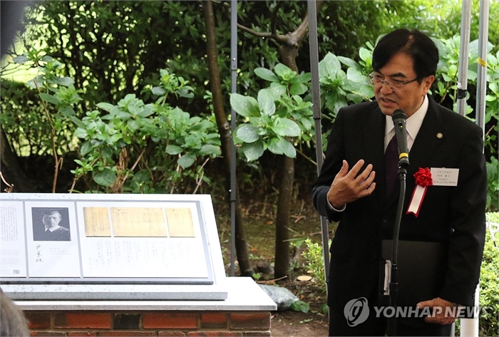 일본 도쿄 릿쿄대의 시인 윤동주 기념비 제막식에서 니시하라 렌타 릿쿄대 총장이 인사말을 하고 있다.
