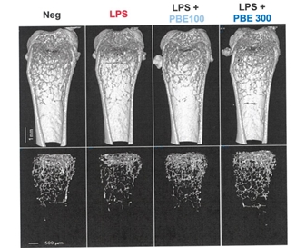 LPS 처리 골소실 마우스에서 꽃벵이 추출물 섭취군은 LPS 대조군에 비해 대퇴골의 골밀도와 골체적비가 유의적으로 증가하였음. LPS는 세균 세포벽 성분으로 체내 염증을 일으켜 골소실 모델 실험에 사용됨. 농촌진흥청 제공