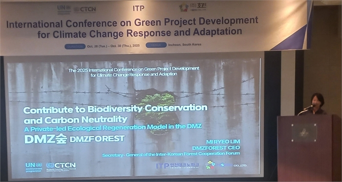28일 인천 송도 센트럴파크호텔에서 열린 '2025 기후변화 대응 및 적응을 위한 녹색 사업 개발 국제 콘퍼런스'에서 임미려 'DMZ숲' 대표가 생물다양성 보존 및 탄소 중립에 기여하고 있는 DMZ숲에 관해 소개하고 있다. 연합뉴스
