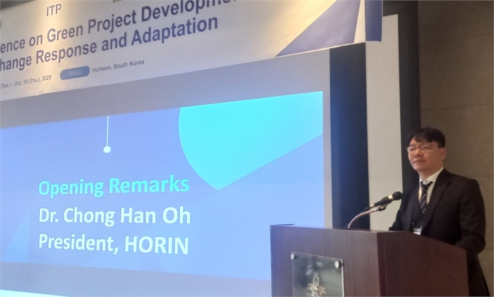'2025 기후변화 대응 및 적응을 위한 녹색 사업 개발 국제 콘퍼런스' 공동 주최자인 ㈜호린 오정한 대표가 개회사를 하고 있다. 연합뉴스