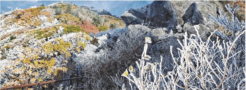 첫 상고대가 핀 덕유산, 고도차가 커 단풍의 색감이 다채롭다. 덕유산국리공원사무소 제공