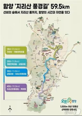경남 함양의 '지리산 풍경길'은 총연장 59.5km로, 지리산 마천 백무동에서 출발해 오도재, 상림공원, 대봉산휴양밸리, 지곡 개평마을, 거연정 등을 거치는 경로다. 거연정과 개평한옥마을, 남계서원을 연결하는 1코스에서는 함양 선비 문화의 흐름을 따라가며 고즈넉한 정취를 느낄 수 있다.