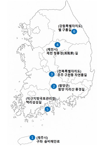 이번에 선정된 관광도로 6곳은 자연경관과 역사문화가 복합적으로 어우러진 제주(구좌 숨해안로)·경남(함양 지리산 풍경길)·전북(무주 구천동 자연품길)·충북(제천 청풍경길)·전남(백리섬섬길)·강원(별 구름길) 등 6개 노선이다.