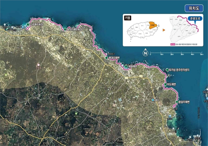 제주의 '구좌 숨해안로'는 제주 구좌읍 지역을 지나는 해안도로로, 에메랄드빛 제주바다를 감상할 수 있는 경관 우수 도로다.