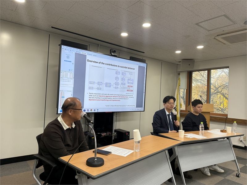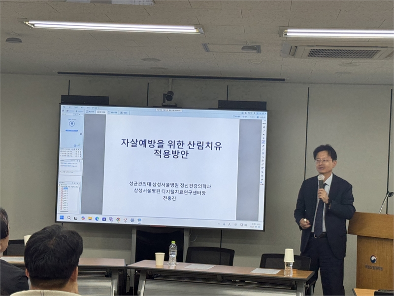 전홍진 삼성서울병원 정신건강의학과 교수(한국생명존중희망재단 이사)가 '자살예방을 위한 산림치유 적용방안'에 대해 발표하고 있다. 국립산림과학원 제공