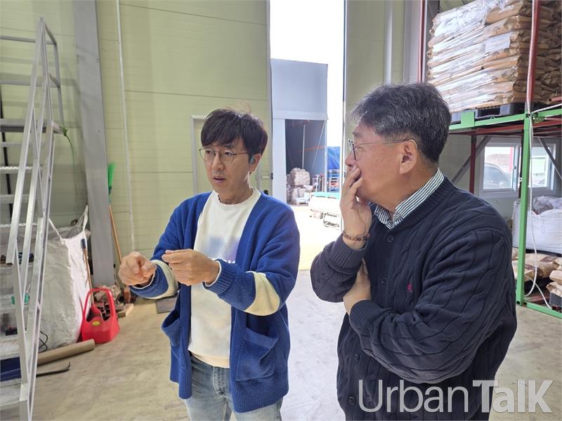 코아람 문양현 대표(왼쪽)가 어반톡 이형철 대표(오른쪽)에게 친환경 코르크 제조의 전 과정을 직접 구축한 내용을 설명하고 있다.