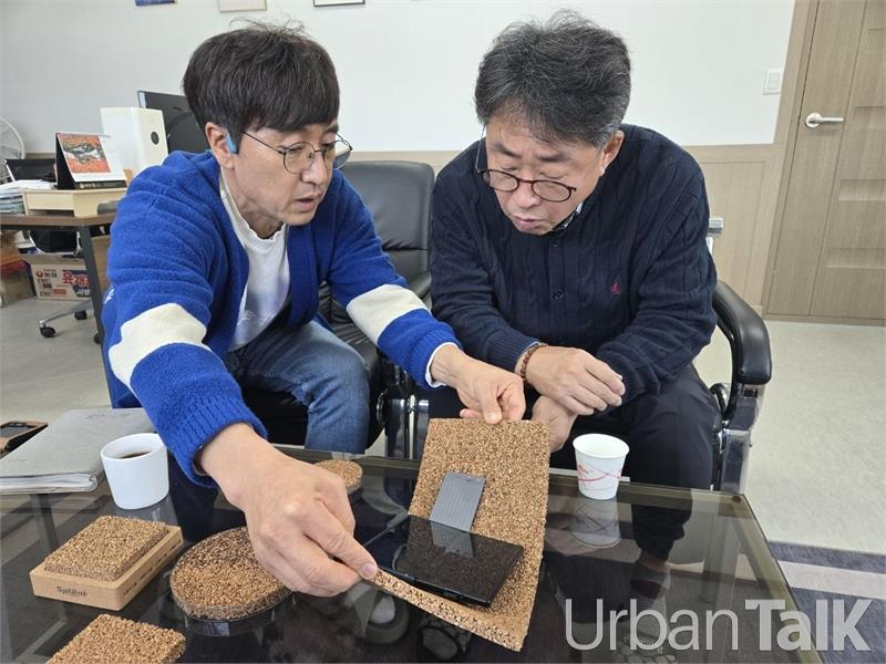 코아람 문양현 대표(왼쪽)가 어반톡 이형철 대표(오른쪽)에게 코아람이 제조한 높은 탄성력의 코르크 제품을 설명하고 있다.