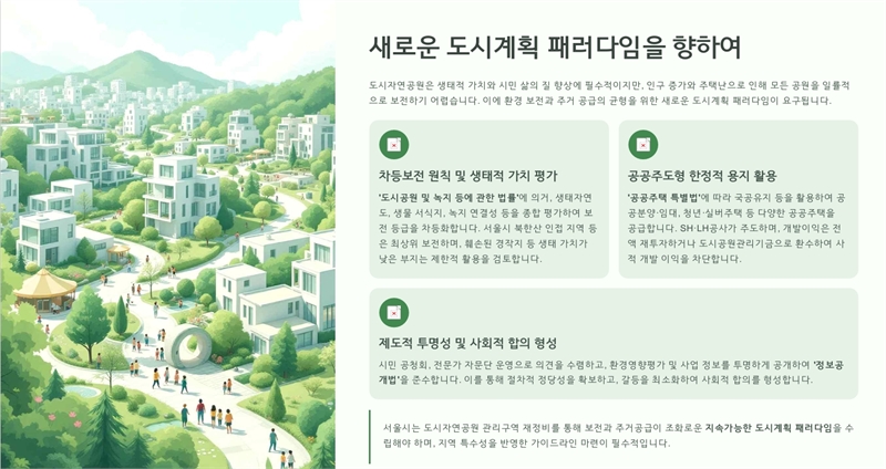 특히 정 교수는 도시자연공원구역 중 개발 가능 지역을 선별해 주택용지로 전환할 경우, 서울시의 주택공급 확대와 토지 소유주의 재산권 보호라는 두 마리 토끼를 잡을 수 있다고 주장했다. 그는 "환경 보전 가치가 높은 핵심 녹지는 철저히 보호하되, 주변부의 개발 가능 지역을 단계적으로 주택용지로 활용하는 선택적 재정비 방안이 필요하다"고 제시했다.