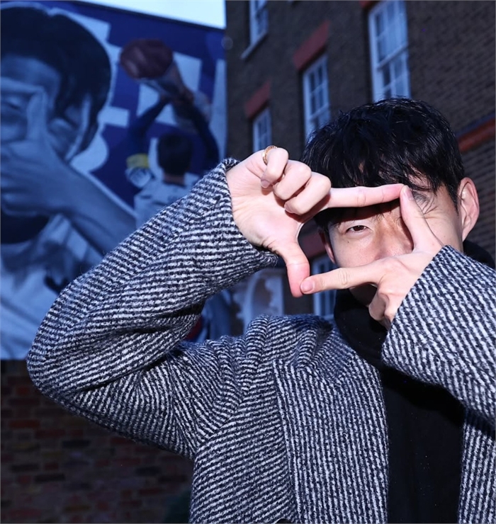 자신의 모습이 단긴 벽화 앞에서 찰칵 세리머니를 펼치는 손흥민. 토트넘 홋스퍼 SNS 캡처