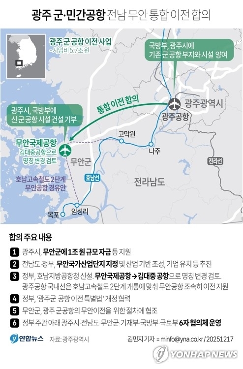 광주 군 공항 이전 당사자인 광주시·전남도·무안군·기획재정부·국방부·국토교통부 등 6자는 17일 첫 공식 협의체 회의를 열고, 광주 군·민간공항을 무안으로 통합 이전하는 내용의 공동 발표문을 공개했다.
