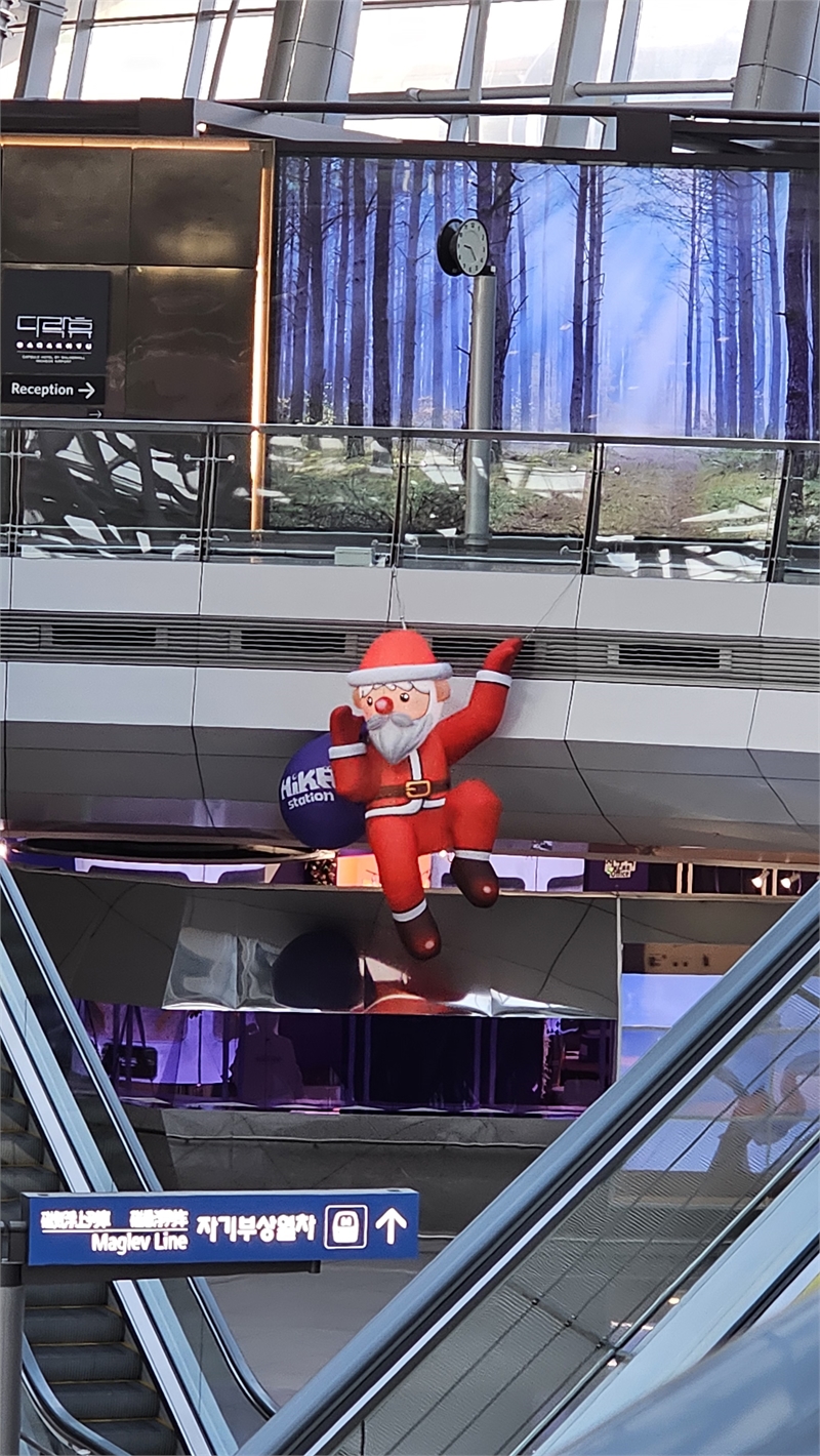 인천공항에는 산타클로스가 매달린 채 손을 흔든다.