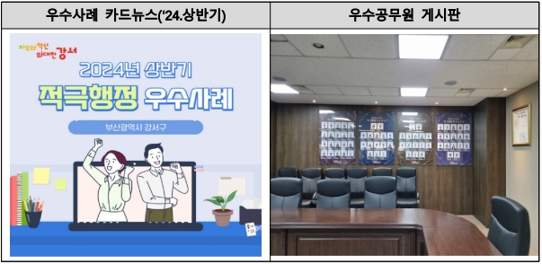 강서구는 청렴도 향상을 위해 부산시 구·군 최초로 '청렴문화 조성 및 지원 조례'를 제정하고, 적극행정 우수공무원 우대, 납세자보호관 운영 활성화를 통한 재·세정 업무 투명성 강화, MZ세대 중심 청렴동아리 '청렴혁신단' 운영 등 다양한 시책을 펼쳐왔다. 구청장과 고위직이 직접 나서는 청렴 캠페인과 갑질 근절 문화 확산도 조직 내 청렴 의식 제고에 기여했다.