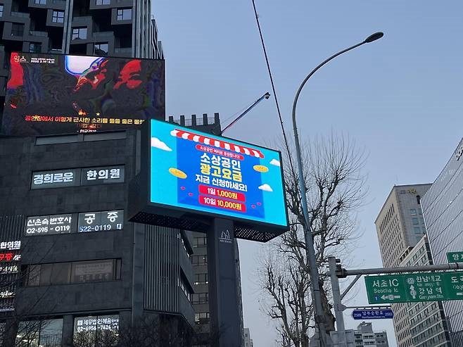 양재역 전자게시대. 서초구는 경기 침체로 어려움을 겪는 소상공인들의 부담을 덜어주고자 지난 3월 전자게시대 광고 단가를 80% 인하했다. 서초구 제공