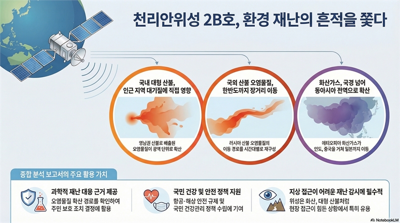 이번 보고서는 천리안위성 2B호가 2021년부터 올해까지 관측한 대기오염물질의 분포와 확산 양상을 시간대별로 정리해, 환경재난이 대기질에 미치는 영향을 체계적으로 담아낸 것이 특징이다.
