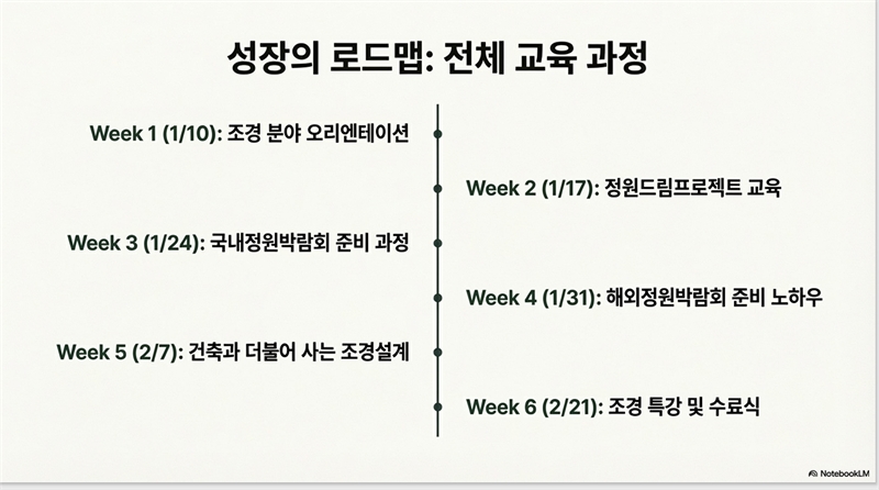 교육 과정은 현장에서 즉시 적용 가능한 실무 중심으로 설계되었다. ▲ 1월 10일 조경 분야 오리엔테이션을 시작으로, ▲정원드림프로젝트 교육(1/17) ▲국내정원박람회 준비 과정(1/24) ▲해외정원박람회 준비 노하우(1/31) ▲건축과 더불어 사는 조경설계(2/7) ▲조경 특강 및 수료식(2/21) 등이 순차적으로 펼쳐진다.