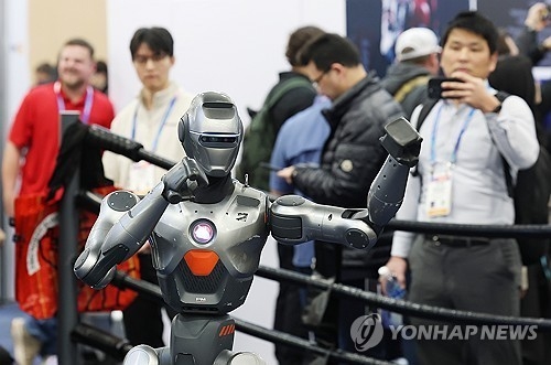 2025 대구 국제로봇 산업전에서 중국 기업 유니트리의 휴머노이드 로봇 G1이 킥복싱 경기를 선보이고 있다