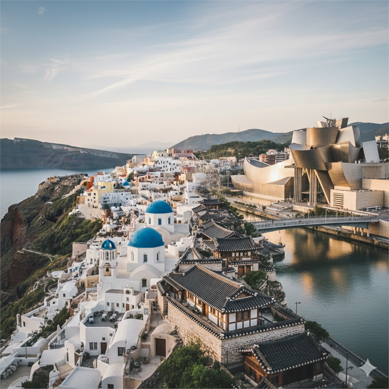 그리스 산토리니, 전주 한옥마을, 스페인 빌바오를 이미지화한 그림. AI 생성이미지 그리스 산토리니 섬. 흰색 회벽과 파란 지붕으로 통일된 독특한 건축양식이 섬 전체를 하나의 예술작품으로 만들어 세계적인 관광지로 자리매김했다. 전주 한옥마을. 도심 속 한옥을 지키기 위해 주민들은 불편을 감수했다. 현대적 건축자재 사용 제한,