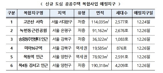 X 신규 도심 공공주택 복합사업 예정지구. LH 제공 한국토지주택공사(LH)는 서울 양천구 목동역 인근 등 6곳이 도심공공주택복합사업(도심복합사업) 예정지구로 지정 공고됐다고 26일 밝혔다. 공공주택특별법에 따르면 도심복합사업 예정지구로 지정된 지역은 주민 의견 청취를 위한 공람·공고 절차에 들어가면 예정지구로