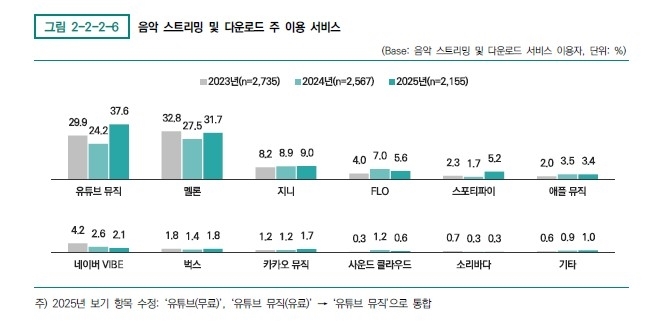 국내 음원 플랫폼 가운데 유튜브 뮤직의 이용률이 가장 높은 것으로 나타났다. 구글이 유튜브 뮤직 기능이 미포함된 '유튜브 프리미엄 라이트' 출시를 예고하면서 점유율에 변동이 생길 가능성이 제기되는 가운데, 음원 플랫폼들은 오프라인 행사를 강화하며 고객 잡기에 힘쓰고 있다. 24일 한국콘텐츠진흥원의 '2025 음악산업백서