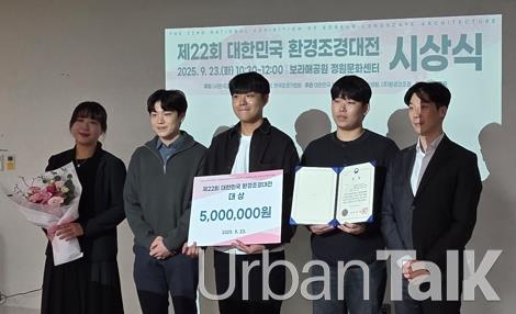 대한민국 환경조경의 미래를 책임질 젊은 인재들의 창의력이 한자리에 모였다.23일 서울 보라매공원에서 열린 ‘제22회 대한민국 환경조경대전 시상식’에서 상명대학교 팀이 출품한 작품 ‘흙의 움직임(Soil in Motion)’이 영예의 대상을 차지했다. 환경조경학과 홍주형·유민우, 그린스마트시티학과 전아현·김윤태 등 4명으로