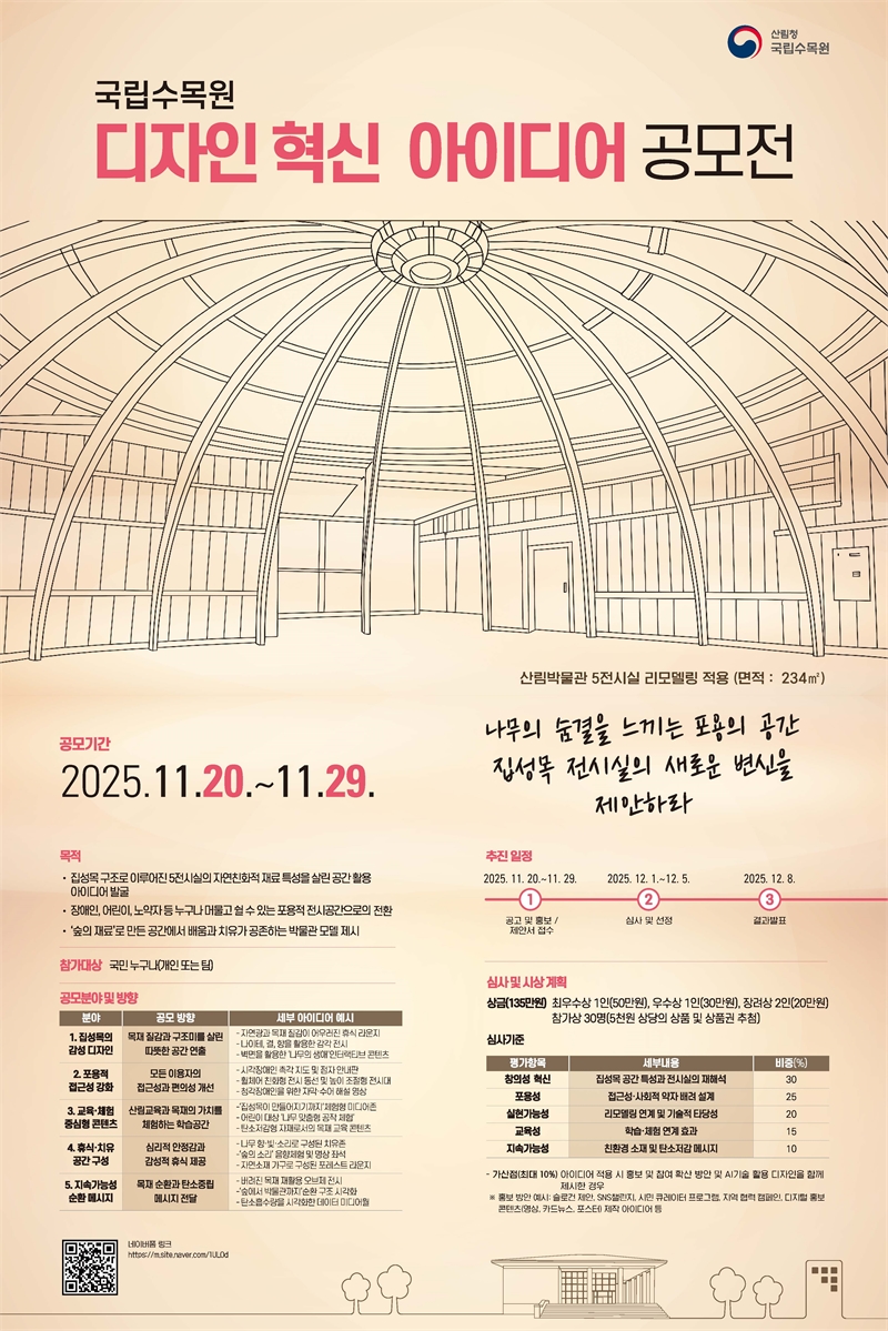 장애인·어린이·노약자 등 사회적 약자를 배려한 포용적 전시공간 조성에 초점을 둔 산림박물관 디자인 공모전이 열린다.산림청 국립수목원은 20일부터 29일까지 10일간 '산림박물관 5전시실 디자인 혁신 아이디어 공모전'을 개최한다고 밝혔다. 이번 공모전은 국민과 함께 만드는 미래 산림박물관 모델 구축을 위한 프로젝트로, 집성
