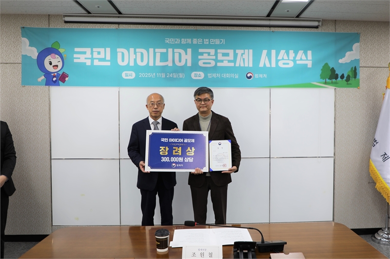 창원특례시 푸른도시사업소 공원녹지과 녹지조성팀장 정익송은 24일 법제처가 주관하는 '국민과 함께 좋은 법 만들기, 국민 아이디어 공모전'에서 장려상을 수상하여 법제처장(차관급)상을 받았다.이번 공모전에는 전국에서 총 1,348건의 국민제안이 접수된 가운데, 정익송 팀장은 '임업후계자'의 연령 제한 완화 아이디어를 제안해