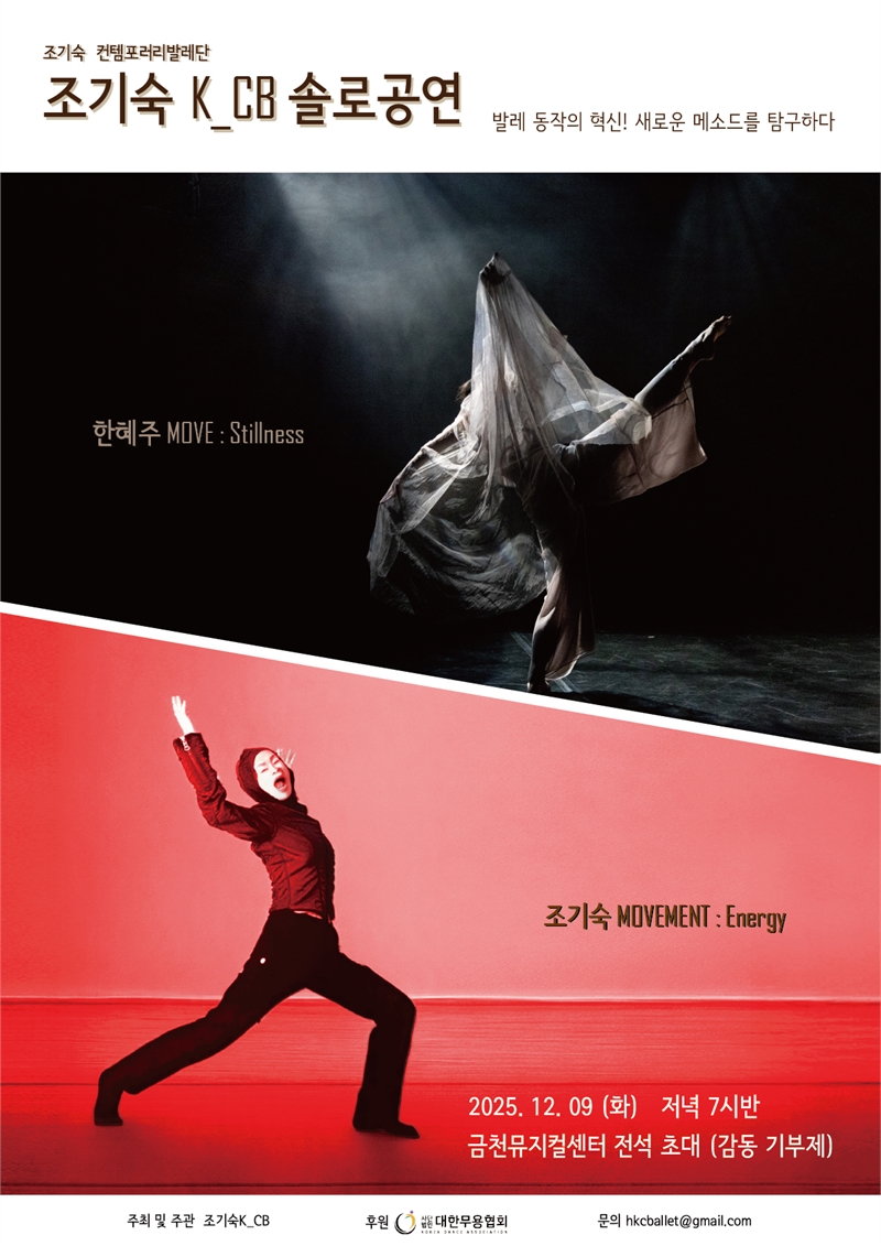 20년 만에 단독으로 무대에 서는 무용가 조기숙 교수가 실험적 솔로 공연을 선보인다.조기숙 컨템포러리발레단은 오는 9일 오후 7시 30분 금천뮤지컬센터에서 '조기숙 K_CB 솔로공연'을 열고, 인간의 몸과 자연의 움직임을 새롭게 탐구하는 발레 레퍼토리를 공개한다고 밝혔다. 에너지와 정지, 상반된 키워드로 풀어내는 몸의 언