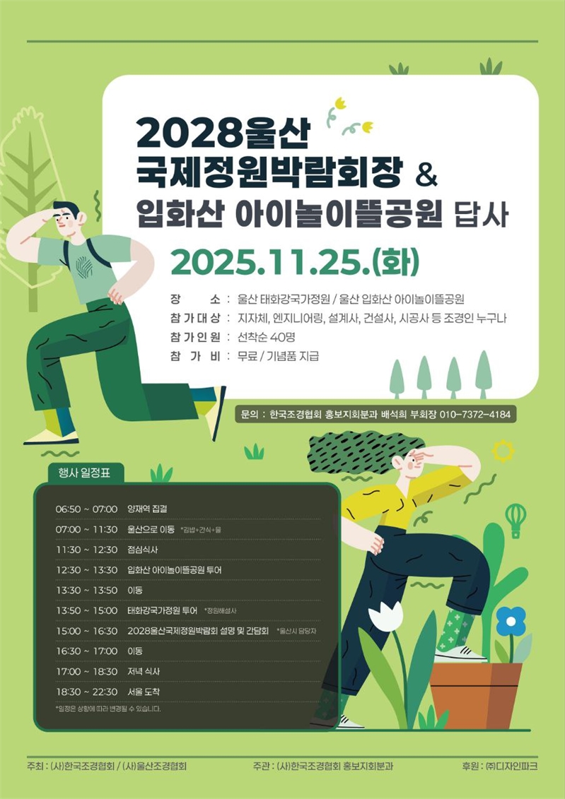‘2028 울산국제정원박람회’의 성공 개최를 기원하는 현장 답사가 오는 25일, 울산 태화강 국가정원과 입화산 아이놀이뜰공원 일대에서 열린다. 이번 답사는 울산국제정원박람회 준비 상황을 공유하고, 조경 전문가 간 교류와 홍보를 활성화하기 위한 취지로 마련됐다.(사)한국조경협회와 (사)울산조경협회가 공동으로 주최한 이번 행