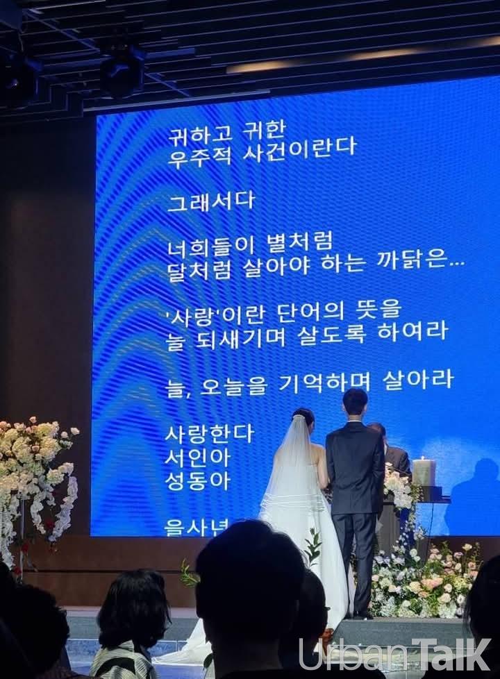 화사한 꽃향기와 은은한 샹들리에 조명 아래서 하객들의 축복을 받은 신랑 신부는 아름다웠고, 사회자의 유쾌한 진행과 신랑 아버지가 준비한 영상과 유려한 덕담, 친구의 축사와 축가는 과하지도 부족하지도 않게 잘 어우러진 토크 콘서트 같았다.