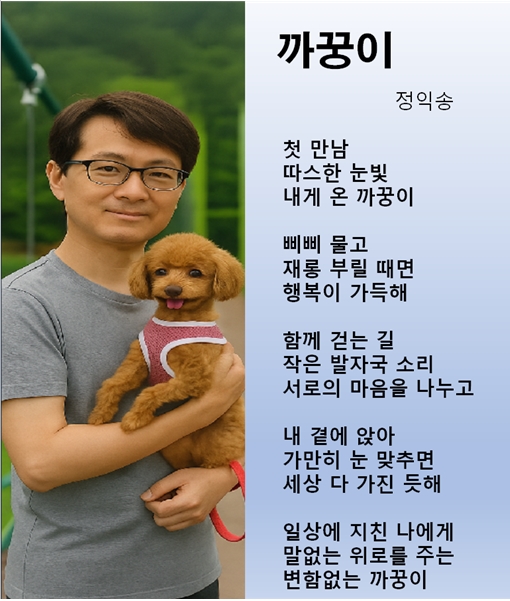 * 결국 정익송 시인의 창작시 '까꿍이'는 반려동물과의 깊은 유대감과 그 존재가 주는 따뜻한 위로를 감성적으로 담아낸 작품이다. 시인의 섬세한 관찰과 진솔한 감정 표현이 돋보이며, 독자에게도 반려동물이 우리 삶에 얼마나 큰 행복과 위안을 가져다주는지 다시금 생각하게 하는 깊은 울림을 전해준다.