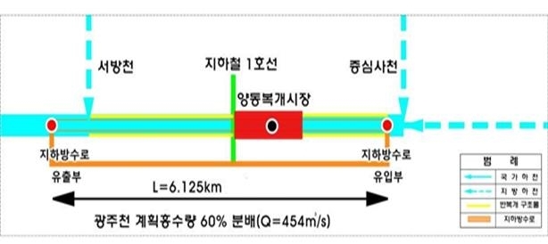 광주천 빗물터널은 증심사천∼양동복개시장∼서방천 등 광주청 본류 구간 약 6㎞에 걸쳐 지하 30m 깊이에 건설되는 배수 시설이다.