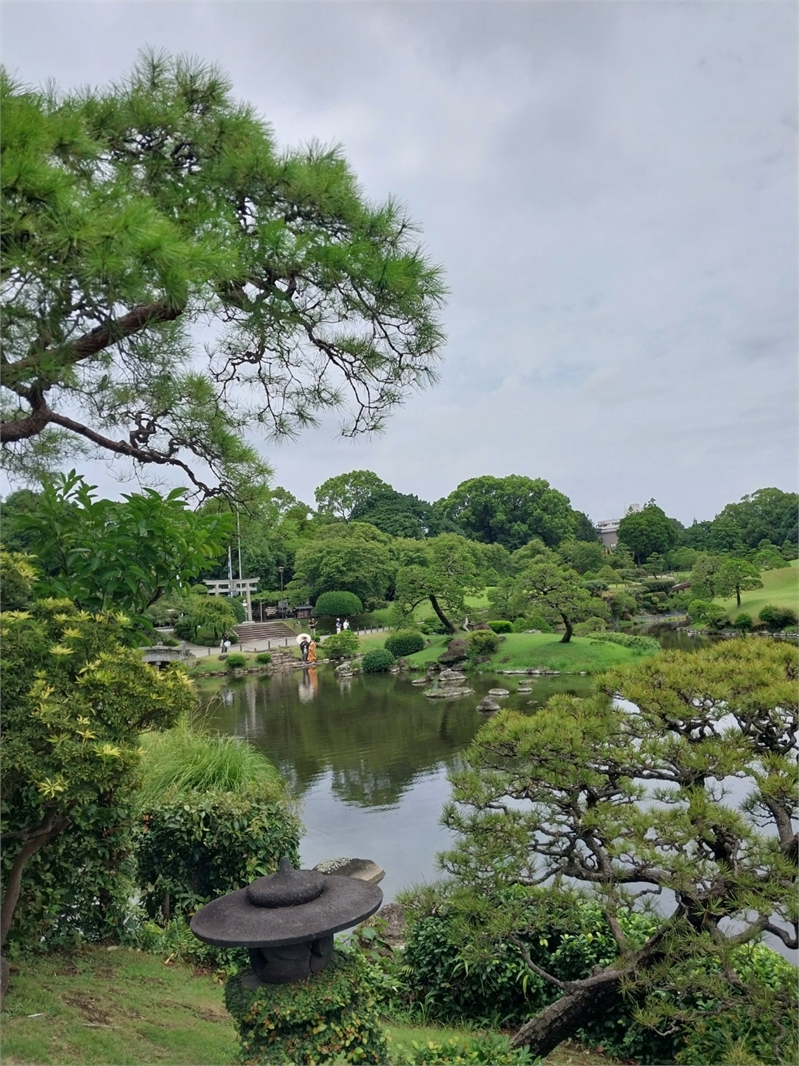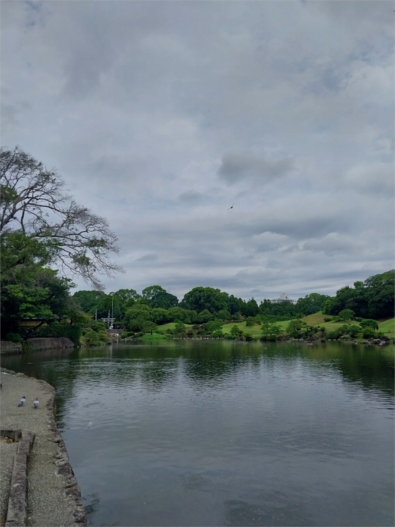 스이젠지 정원(水前寺 成趣園)은 한눈에 보아도 완벽하게 다듬어진 풍경화 같았다. 낮게 깎인 잔디 언덕과 부드럽게 굽이치는 연못, 그 뒤로 보이는 인공 후지산이 마치 사무라이의 자존심을 조용히 숨기고 있는 듯했다.