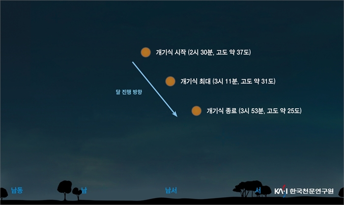 달이 지구 그림자에 가장 깊게 들어가는 '최대식' 시각은 오전 3시 11분으로, 남서쪽 하늘에서 관측할 수 있다.
