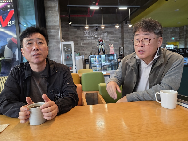백 대표(왼쪽)가 어반톡 이형철 대표와 인터뷰를 하고 있다.