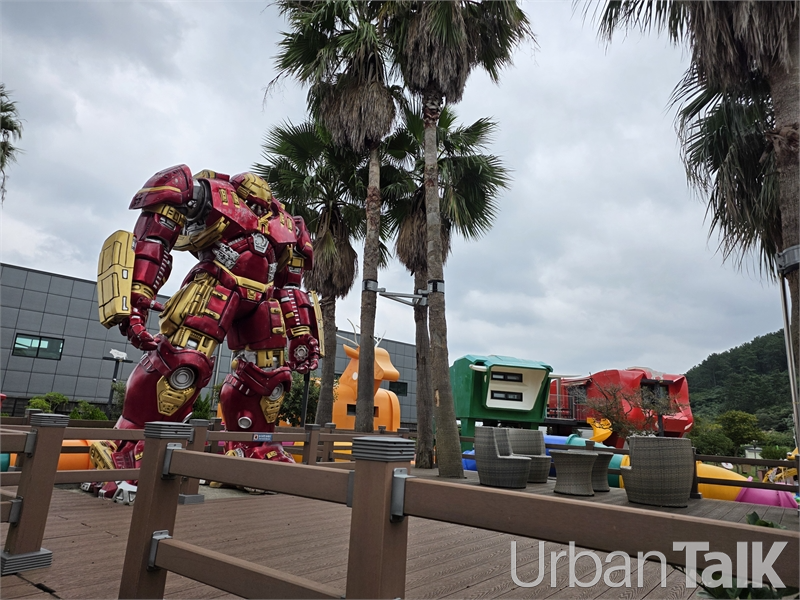 수영장 옆에는 아이언맨의 슈트인 거대한 '헐크버스터'가 서 있다.