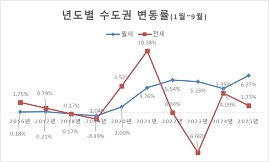 수도권 월세가격은 2016년부터 2019년까지 소폭 등락하다가 임대차 3법이 시행된 2020년 1% 상승했고, 2021년에는 4.26% 올랐다. 이후 2022년 5.54%, 2023년 5.25%, 2024년 4.09% 상승을 기록했다.