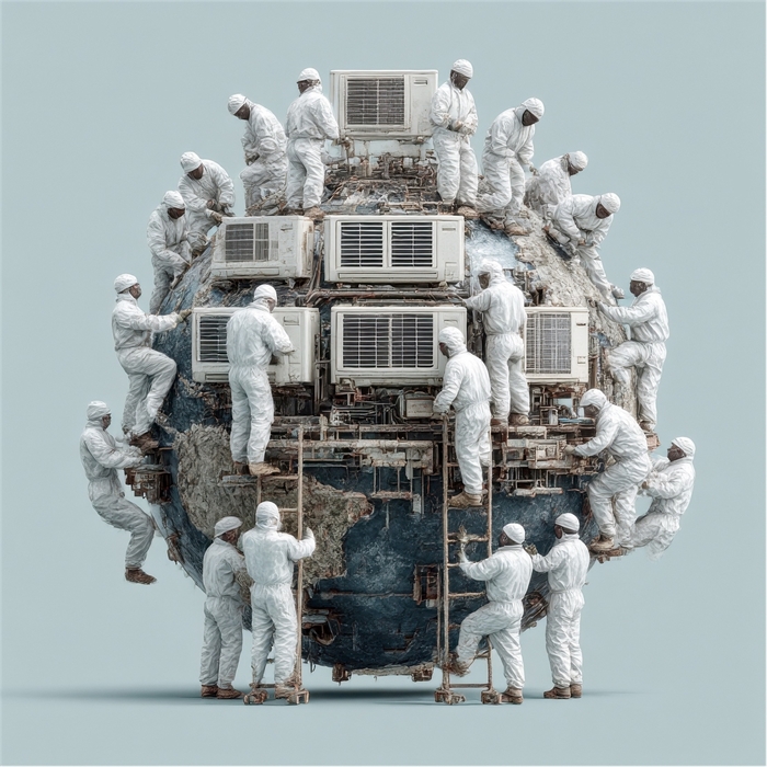 '지구냉각'은 지구온난화와 기후위기에 대한 강렬한 역설적 메시지를 담고 있다. 작품 속 지구는 무수히 많은 에어컨 실외기에 둘러싸여 있는데, 이는 인간이 더위를 피하기 위해 사용하는 냉방기기가 오히려 지구를 더 뜨겁게 만드는 모순을 상징한다. 에어컨 실외기에서 뿜어져 나오는 뜨거운 열기가 대기를 데우고, 전력 소비 증가로 인한 온실가스 배출이 지구온난화를 가속화하는 악순환을 시각적으로 표현했다. 개인의 편의를 위한 선택이 결국 지구 전체의 위기로 이어진다는 경고의 메시지를 AI 기술을 활용해 효과적으로 전달한 작품이다.