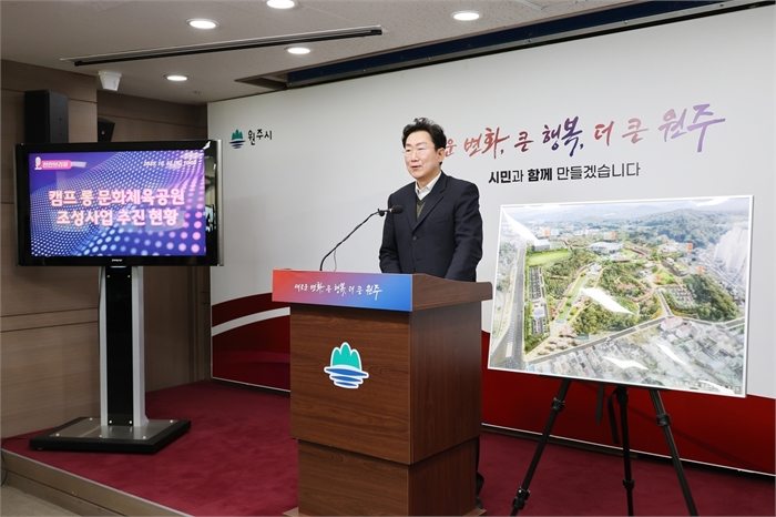 캠프 롱 문화체육공원 조성 사업 브리핑하는 원강수 시장. 원주시 제공