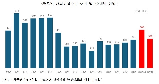 반면 내년에는 해외 건설 수주가 23.7% 감소한 382억달러에 그칠 것으로 예상했다.