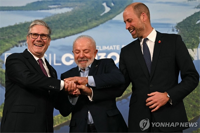 손 맞잡는 영국 윌리엄 왕세자(오른쪽부터), 룰라 브라질 대통령, 키어 스타머 영국 총리