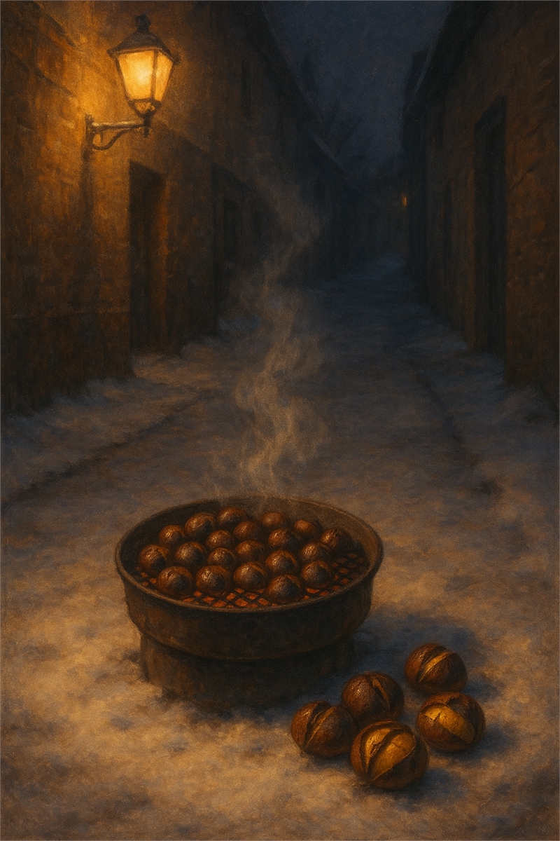 "조심스레 까먹는 달콤한 한 알 / 입안 가득 퍼지는 소박한 미소"는 평범한 군밤이 어떻게 소소한 위안과 행복으로 다가오는지를 보여준다. 차가운 겨울바람 속에서 군밤을 통해 느끼는 따스함은 삶의 작은 위로를 상징하며, 단순한 것에서 발견하는 행복의 본질을 조명한다.