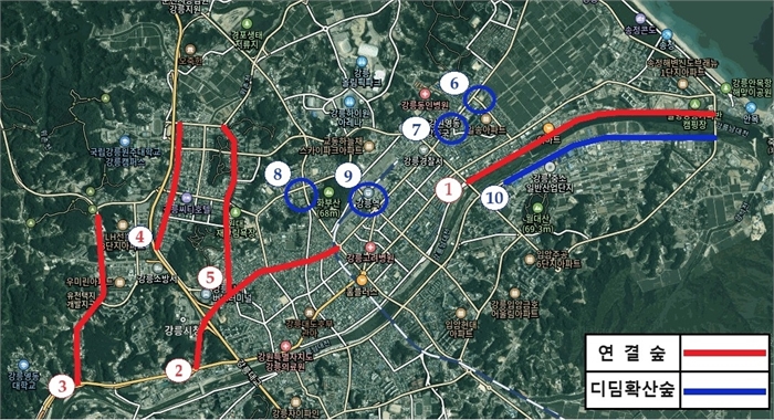 연결숲(15.4㎞): 강릉대로 등 5곳 도심 가로변에 관목과 교목을 복층으로 심은 녹지대를 신규 조성한다. 이를 통해 단절된 숲을 하나로 이어 바람길을 확보한다.