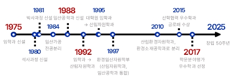충남대학교 산림환경자원학과는 1975년 농과대학 임학과로 개설된 이후, 1988년 임산가공학과의 분리와 2010년 ‘산림환경자원학과’로의 명칭 변경을 거쳐 오늘에 이르렀다. 학과는 나무 중심의 임학(林學)에서 한 걸음 나아가, 숲과 환경을 통합적으로 이해하고 연구하는 산림자원·환경 전문가 양성의 요람으로 자리매김해왔다.